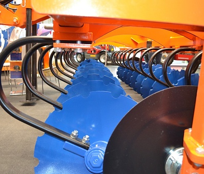 Первая зона обработки представляет собой двухрядную дисковую борону с режущими узлами на пружинной С-образной стойке с диаметром диска 610 мм. Глубина обработки данными узлами составляет до 15 мм, что позволяет произвести полное измельчение пожнивных остатков и перемешивание их с почвой. Пружинная С-образная стойка за счет вибрирующих движений обеспечивает полное перекрытие зоны обработки.