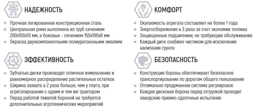 Вместе с оптимально устроенной конструкцией рабочих органов дисковая борона БДТ «Вепрь» имеет и абсолютно надежную сборку, которая включает в себя прочную центральную раму из труб сечением 200х100х10 мм, защищенные от механических повреждений подшипниковые узлы, гидропневмоаккумулятор и усиленные гидроцилиндры, которые изготовлены по итальянской технологии.