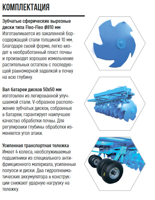 Одна борона заменяет три плуга с тракторами такого же тягового класса. Рабочими органами являются сферические вырезные диски типа Fleo-Fleo диаметром 810 мм. Конструкция бороны обеспечивает безопасное транспортирование.