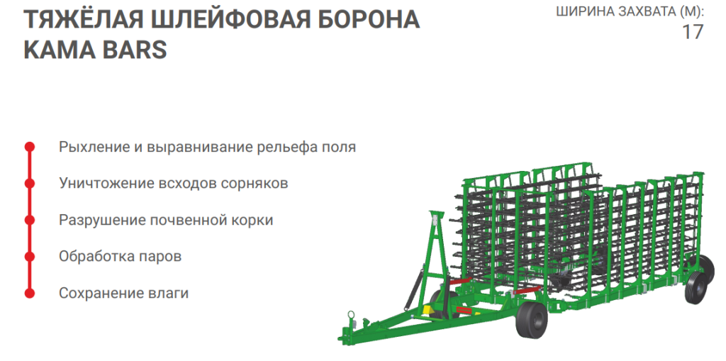 Тяжёлая шлейфовая борона KAMA BARS предназначена для обработки зяби с целью поверхностного рыхления, выравнивания почвы, уничтожения нитевидных всходов сорняков и сохранения влаги. Эффективно использование борон для обработки паров с целью разрушения почвенной корки.