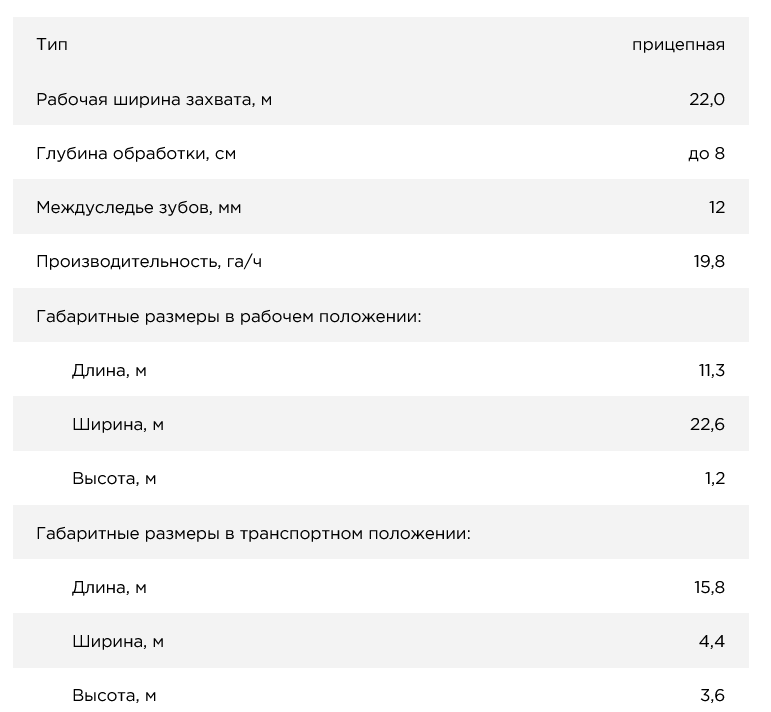 Зубовая борона БЗ-22 позволяет обрабатывать почву шириной 22 м за один проход. Возможно изготовление бороны зубовой с шириной захвата 18 м. На центральную и боковые рамы навешиваются секции зубчатые: на БЗ-18 — 10 секций на БЗ-22 — 12 секций, длина шлейфа — 16 рядов. Расположение рабочих органов (зубов) бороны в 16 рядов позволяет получить высочайшее качество предпосевной обработки почвы.
