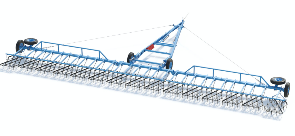 Сцепка зубовых борон гидрофицированная ЗАРЯ СБГ-21-1. Ширина захвата сцепки — 21 м. Производительность 25 гектаров в час.