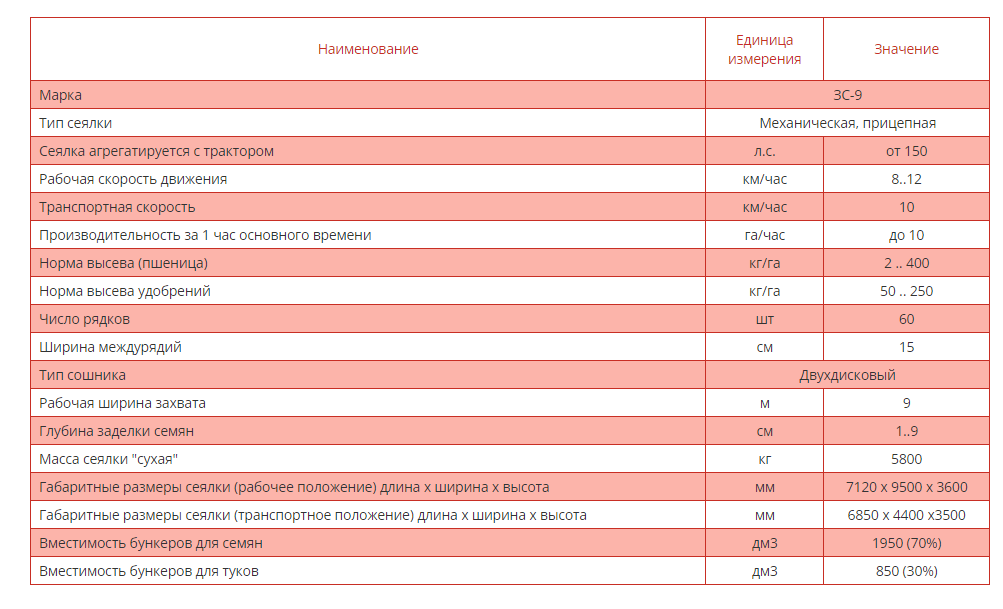 Сеялка ЗС-9 представляет собой широкозахватный складной агрегат, предназначенный для рядового посева зерновых (пшеница, рожь, ячмень, овёс и др.), зернобобовых (горох, соя и др.), мелкосеменных культур и семян трав, размер которых не менее 1,5 мм, с одновременным внесением минеральных удобрений (или без него) и прикатыванием почвы в засеянных рядках.