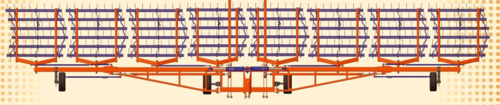 Борона составлена из восьми самостоятельных секций. Каждая секция индивидуально вешается на подвесе за счет цепей что создает нежесткую конструкцию и позволяет идеально копировать рельеф почвы. Расположение пружинных зубьев обеспечивает нарезку борозд (т.е. один зуб следует за другим) что дает обработку с минимальными просветами.