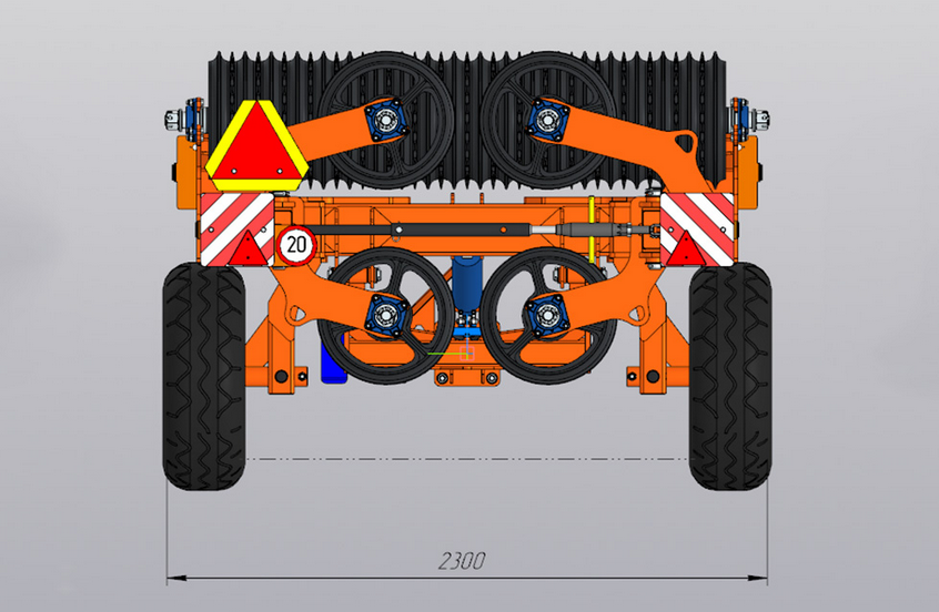 Конструкция катка состоит из пяти модулей: центральный (2 м), 2 боковых (2 м), 2 крайних (1,5 м). Модули связаны между собой шарнирными соединениями, что позволяет копировать неровности поля в пределах ширины модулей. Модуль представляет собой несущий брус, к щекам которого крепится каток (каток имеет возможность демонтажа от модуля без снятия модуля с основной конструкции).