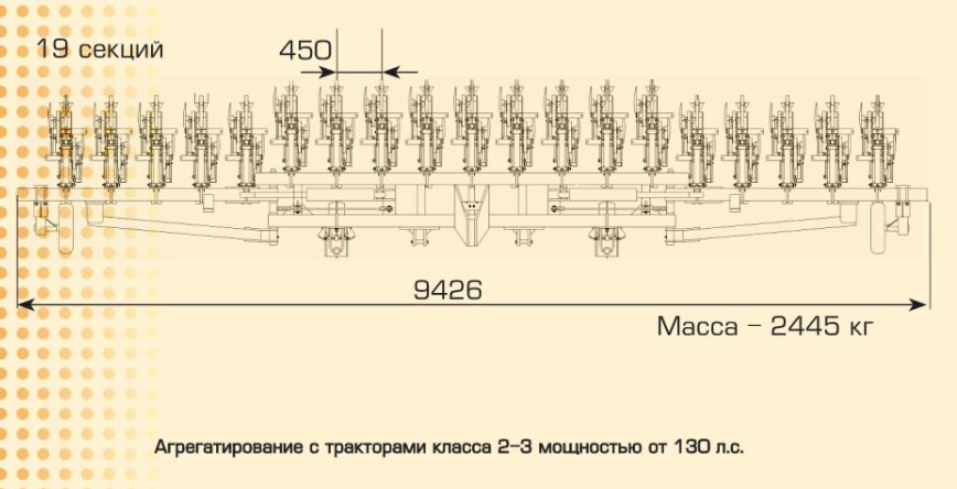 Параллелограммное устройство культиватора обеспечивает точное копирование рельефа почвы с уклонами более 5º, а наличие винтовой пары с упорной резьбой на стойке опорного колеса с мерной шкалой на каждой секции дает возможность точной регулировки глубины обработки.