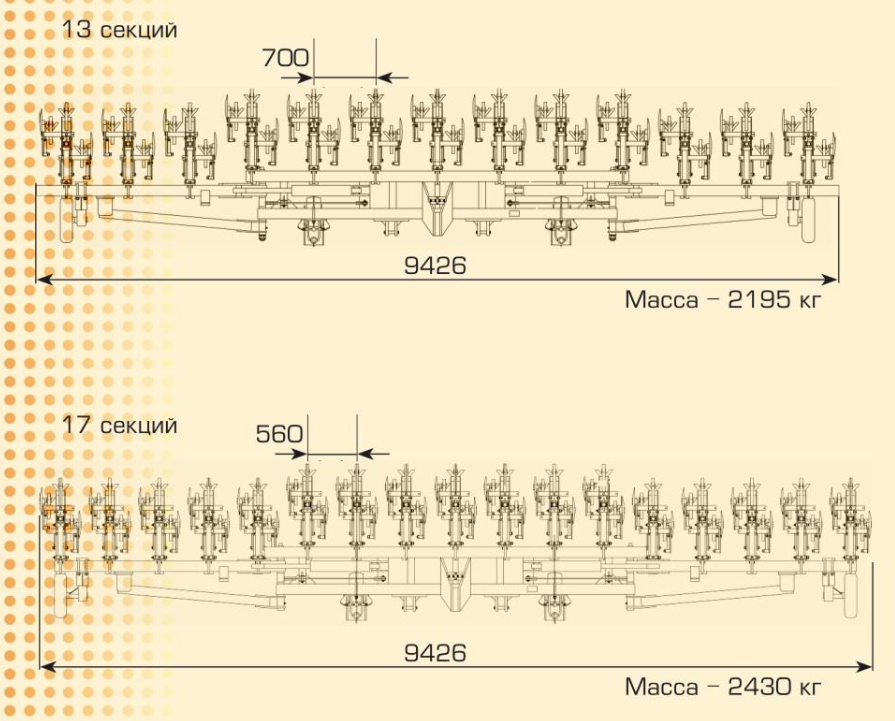 Возможно использование как пружинной, так и жесткой стойки. Базовая комплектация включает пружинные стойки со стрельчатыми лапами, двумя опорными колесами, двумя направляющими колесами с ребордами.