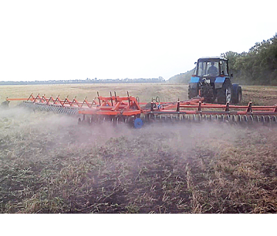 Лущильник работает вразвал от середины орудия. Чем больше угол атаки дисков, тем больше степень рыхления пласта, полнее подрезание растительных остатков и больше глубина обработки почвы.