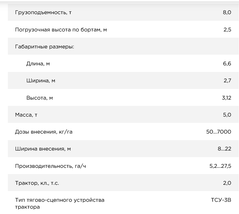 Машина имеет привод подающего транспортера как от колеса машины, что обеспечивает синхронизацию подачи рабочего продукта от скорости движения машины, так и от ВОМ трактора. Машина имеет ручную настройку на вид рабочего продукта и требуемую дозу внесения.