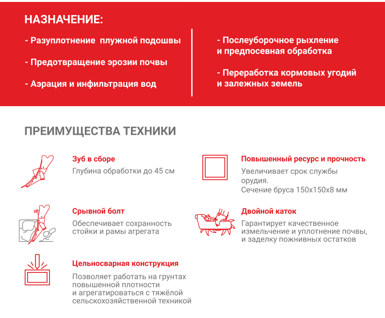 Глубина рыхления почвы составляет 45 см, что обеспечивает надёжное удержание влаги и вентиляцию плодородного слоя.