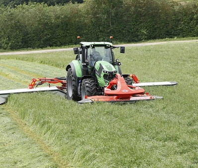 Возможность подъема двух задних частей по отдельности является существенным преимуществом при кошении участков треугольной формы. Маневрирование теперь не представляет сложности и выполняется быстрее. Блок косилки приводится в транспортное положение с помощью клапана двойного действия.