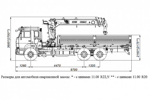 | Высота, мм | с шинами 11.00 R22,5 - 3685; с шинами 11.00 R20 - 3700 |
