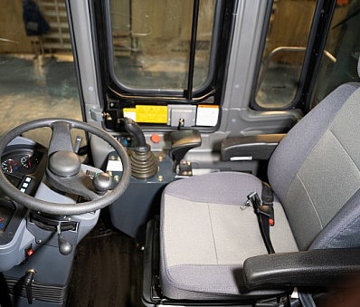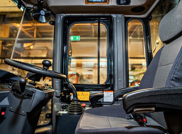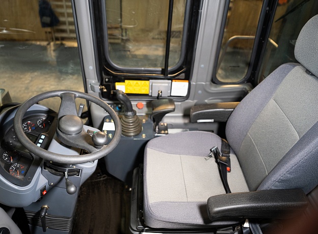 - Регулируемой рулевой колонкой и сиденьем оператора с механической подвеской, высокой спинкой, регулируемыми подлокотниками, подголовником, для снижения усталости оператора.