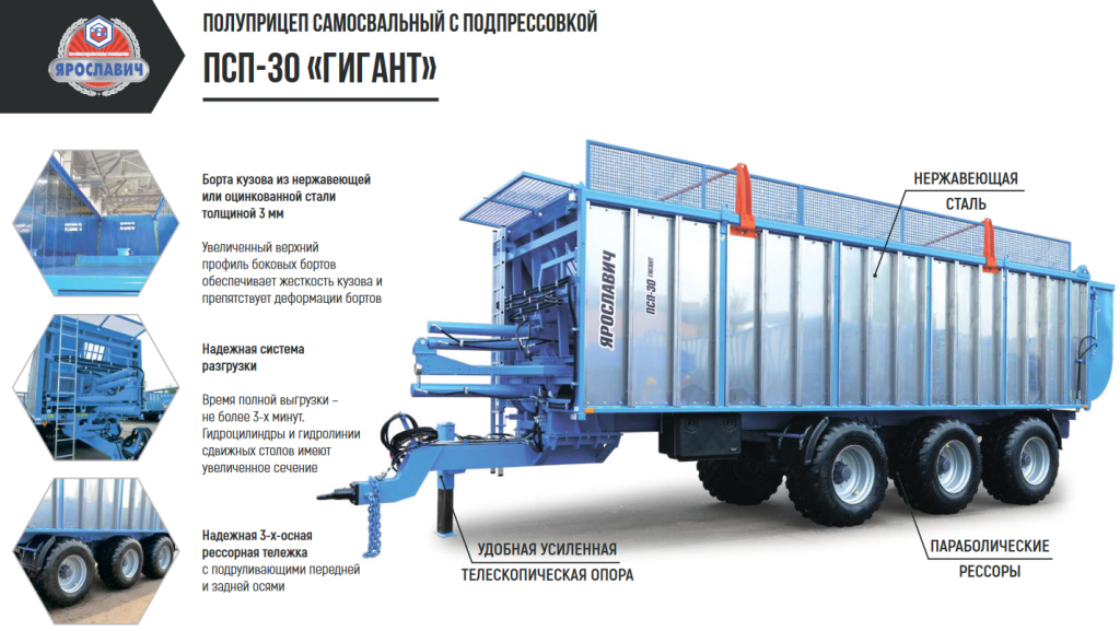 Полуприцеп ПСП-30 «Гигант» предназначен для перевозки различных сыпучих и твердых грузов (зерно, корнеплоды, зеленая масса, силос, сенаж, зерносенаж, навоз, торф, удобрения, опилки, снег и пр.) по всем видам дорог и в полевых условиях. Имеет самую большую грузоподъемность в классе широко известных полуприцепов серии ПСП «Гигант». Является универсальной техникой и может эксплуатироваться круглогодично.
