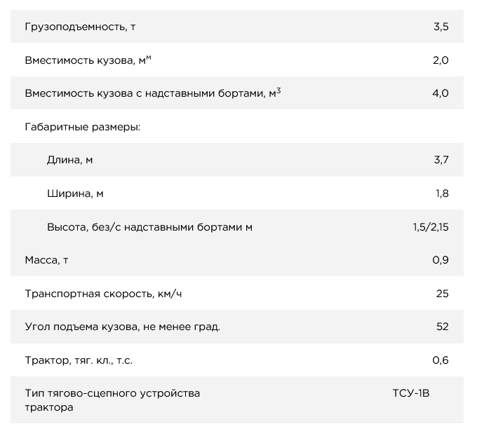 Полуприцеп предназначен для транспортировки различных строительных грузов, асфальта, бетонных смесей и перевозки сельскохозяйственных грузов с выгрузкой назад. Полуприцеп агрегатируется с колесными тракторами класса 0.6-1.4, имеющими тягово-сцепное устройство, вывод гидросистемы и розетку для подключения электрооборудования.
