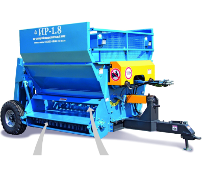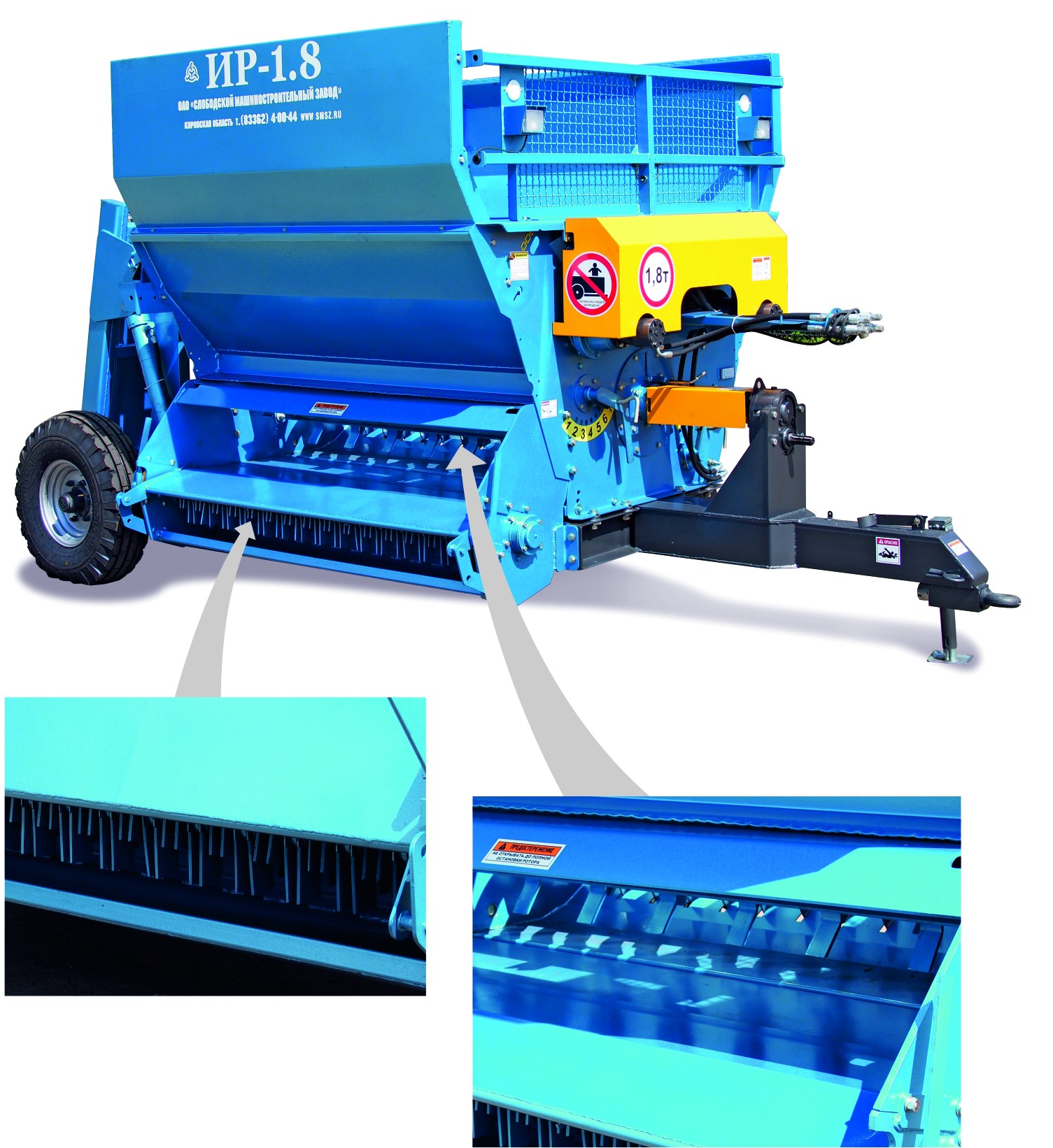 Измельчитель ИР-1,8 с дополнительным ротором имеет доизмельчающий ротор, позволяющий получить повышенную степень измельчения сена 50-70 мм. Возможна работа измельчителя в однороторном варианте. Управление измельчителем производится с помощью тросового гидрораспределителя из кабины трактора.
