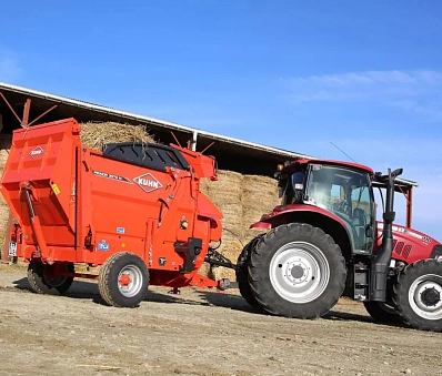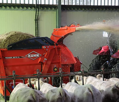 В случае с тяжелыми кормами (корма с длинными волокнами и тюки сенажа), низкое расположение стрелы не позволяет фуражу попасть в турбину. Таким образом, волокна эффективно и равномерно распределяются.