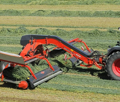 Скорость вращения подбирающего механизма может варьироваться в зависимости от различных условий работы. При необходимости скорость вращения можно снизить, чтобы сохранить целостность листьев деликатных кормовых культур и повысить энергетическую ценность кормов. Широкая лента обеспечивает боковую укладку валка. Обслуживание не предусматривает сложных действий. Регулировка натяжения конвейера занимает всего несколько секунд, не требуя при этом использования каких-либо дополнительных инструментов. В зависимости от потребностей скорость движения конвейера можно снизить, чтобы адаптировать размер и форму валка к размерам уборочной техники.
