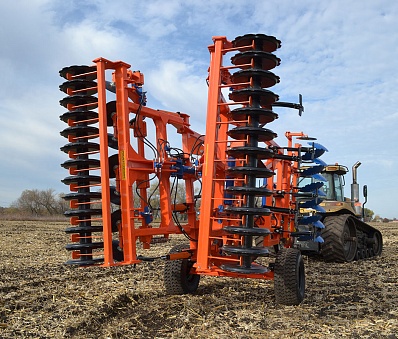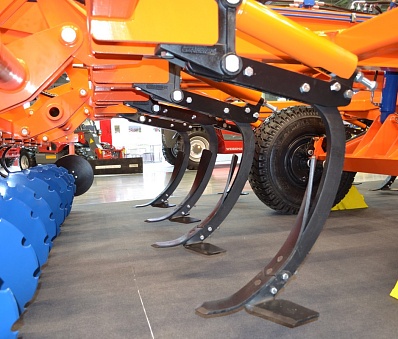 Первая зона обработки представляет собой двухрядную дисковую борону с режущими узлами на пружинной С-образной стойке с диаметром диска 610 мм. Глубина обработки данными узлами составляет до 15 мм, что позволяет произвести полное измельчение пожнивных остатков и перемешивание их с почвой. Пружинная С-образная стойка за счет вибрирующих движений обеспечивает полное перекрытие зоны обработки.