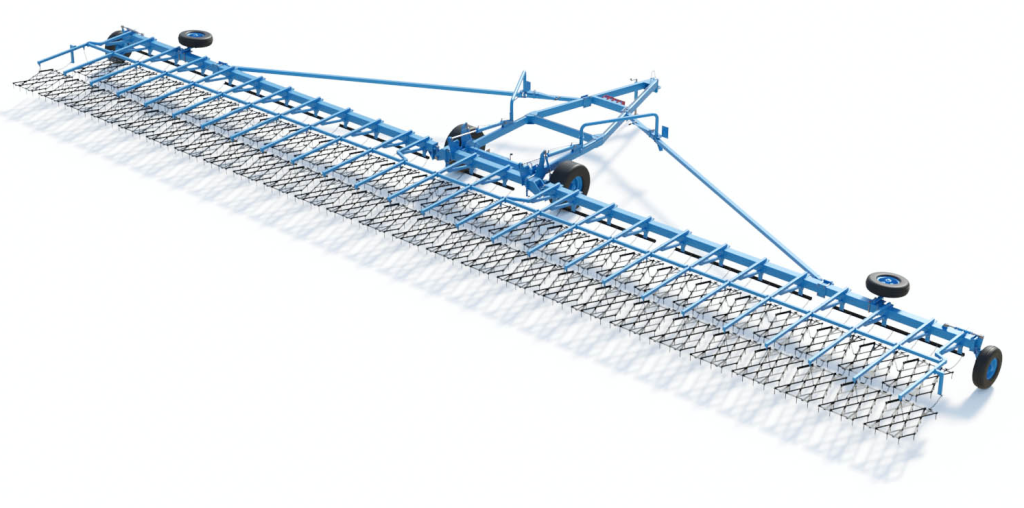 Сцепка зубовых борон гидрофицированная ЗАРЯ СБГ-21-1. Ширина захвата сцепки — 21 м. Производительность 25 гектаров в час.