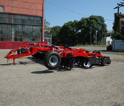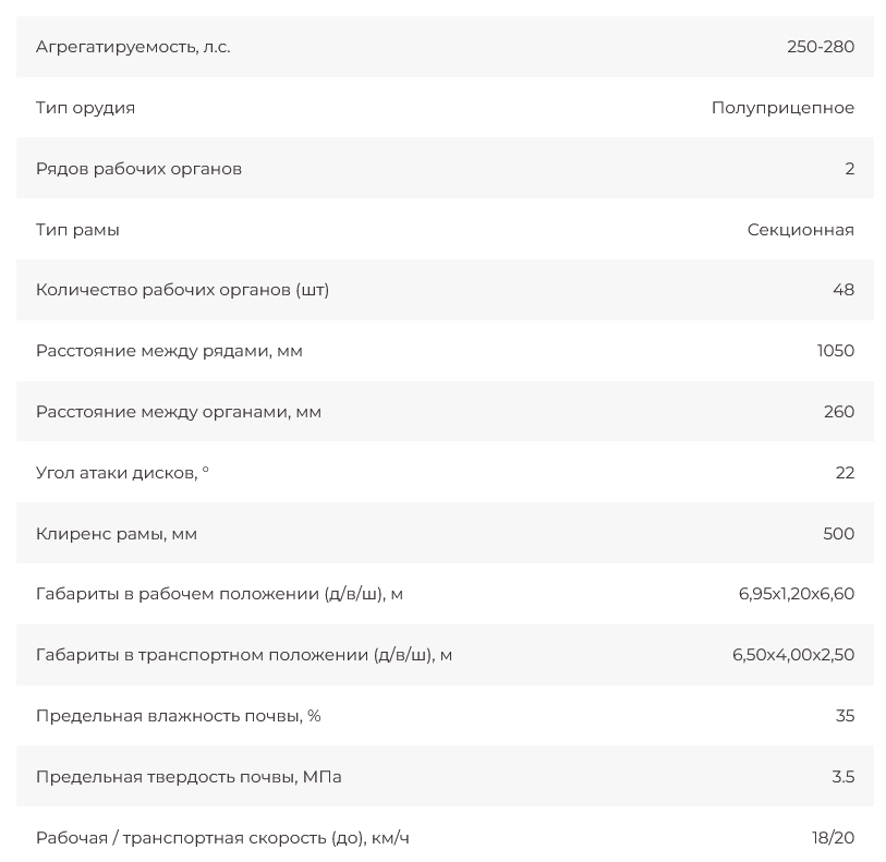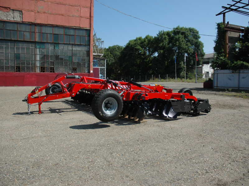 Большая рабочая скорость обработки (до 18 км/ч) позволяет достигать превосходного эффекта измельчения, перемешивания и улучшения крошения почвенного комка, благодаря полному перекрытию рабочей ширины рабочими органами и сдвоенным опорным шлейф-каткам разного диаметра. Вибрация пружинной стойки во время работы дополнительно улучшает крошение почвы. Глубина обработки до 12 см регулируется винтовым механизмом передних опорных колес и задними опорными катками. Сферические диски Bellota диаметром 560 мм установлены наклонно, на индивидуальных пружинных стойках Bellota в 2 ряда, что способствует лучшему обороту отрезаемого пласта, а также снижению требуемого тягового усилия трактора.
